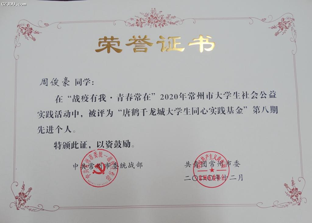 我院優(yōu)秀志愿者代表周俊豪榮獲“戰(zhàn)疫有我 青春常在”2020年常州市大學(xué)社會(huì)公益實(shí)踐活動(dòng)暨“唐鶴千龍城大學(xué)生同心實(shí)踐基金”第八期先進(jìn)個(gè)人榮譽(yù)稱號(hào)。
