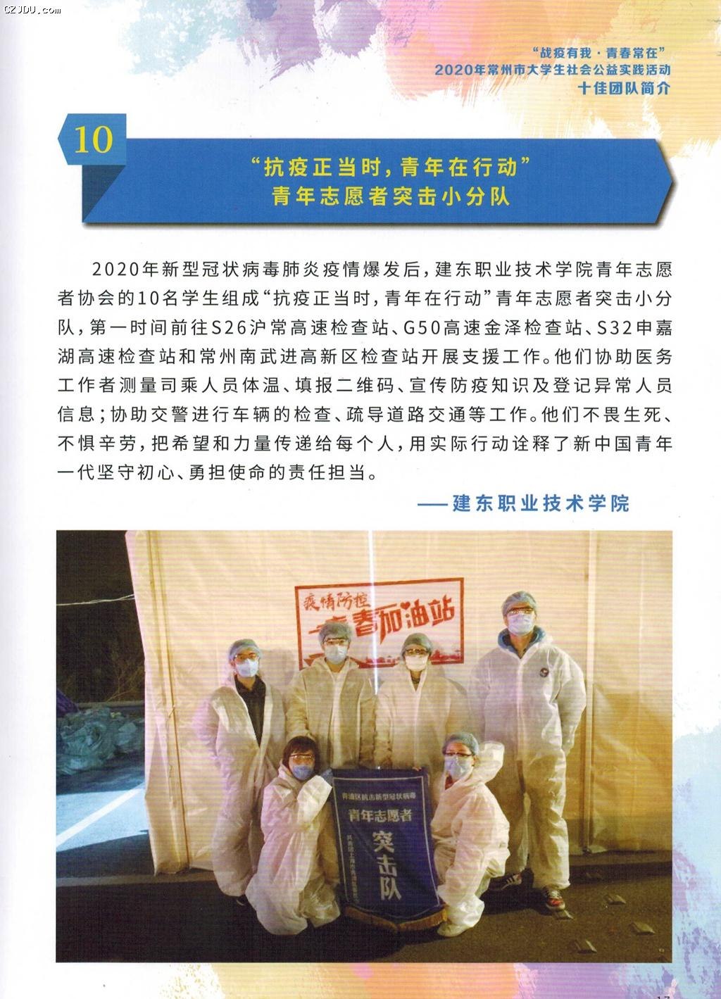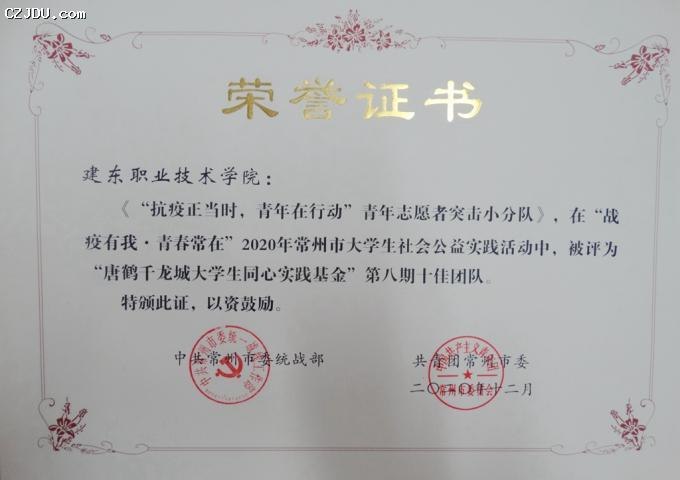 我院優(yōu)秀志愿者項(xiàng)目《“抗疫正當(dāng)時(shí),青年在行動(dòng)”青年志愿者突擊小分隊(duì)》榮獲“戰(zhàn)疫有我 青春常在”2020年常州市大學(xué)社會(huì)公益實(shí)踐活動(dòng)暨“唐鶴千龍城大學(xué)生同心實(shí)踐基金”第八期十佳團(tuán)隊(duì)榮譽(yù)稱號(hào)。