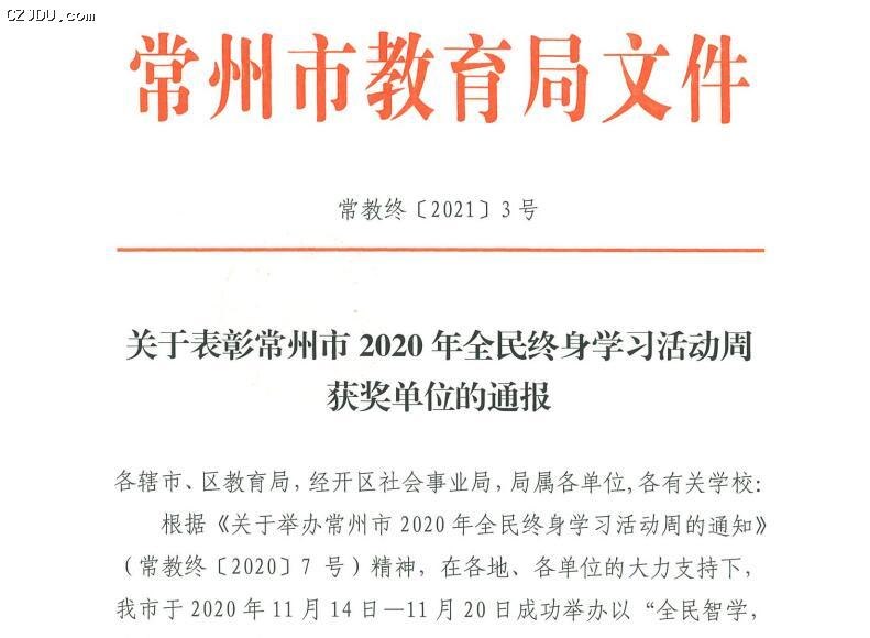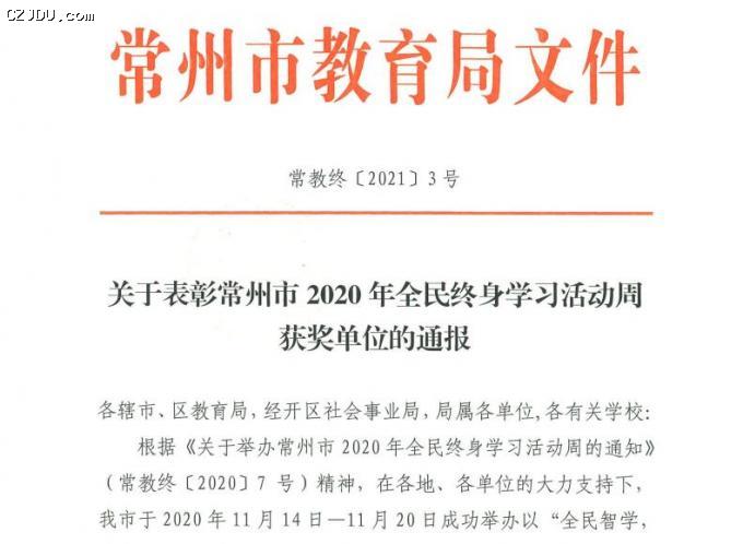 我院獲得常州市2020年全民終身學(xué)習(xí)活動周“優(yōu)秀組織獎(jiǎng)”榮譽(yù)