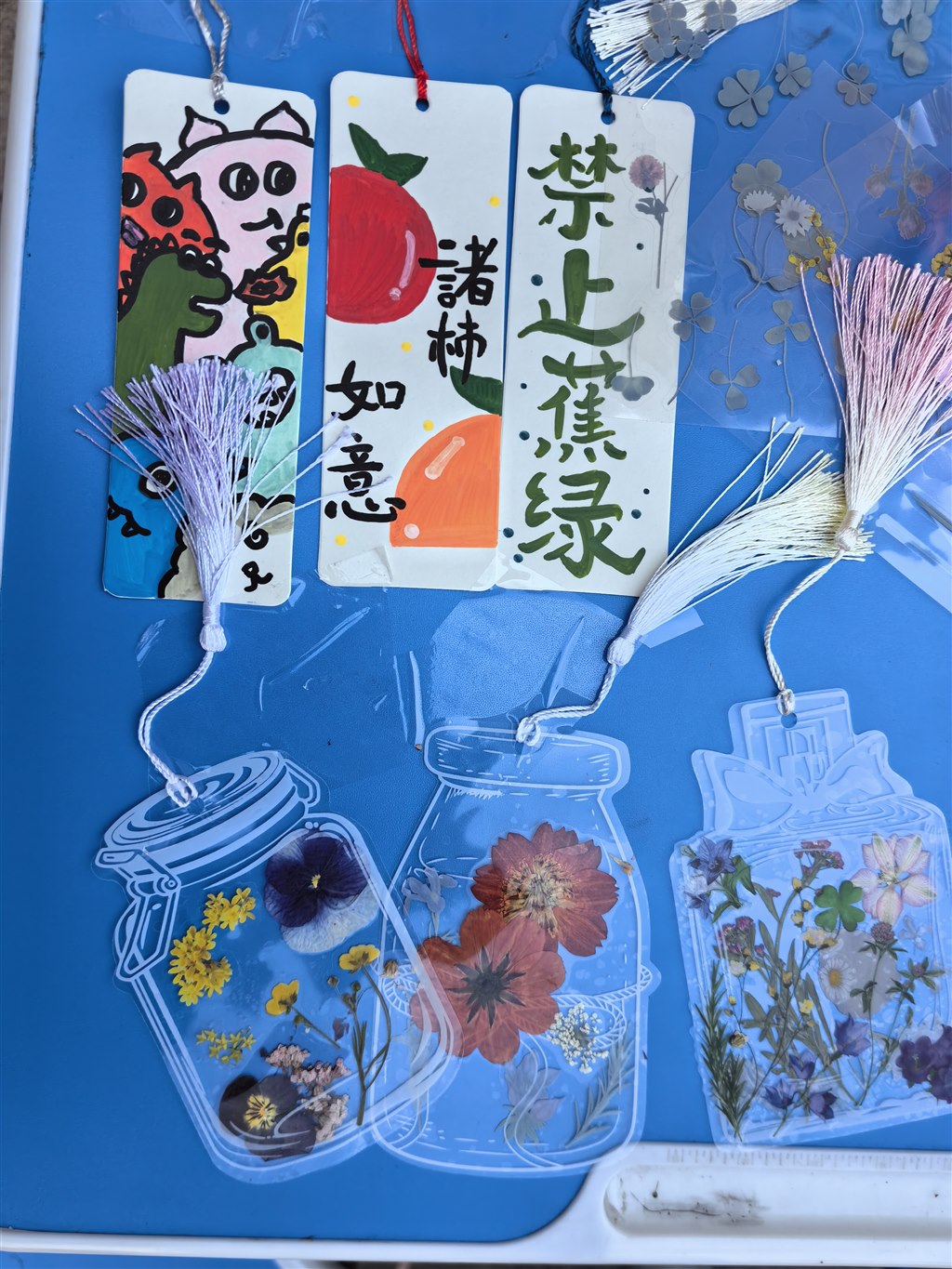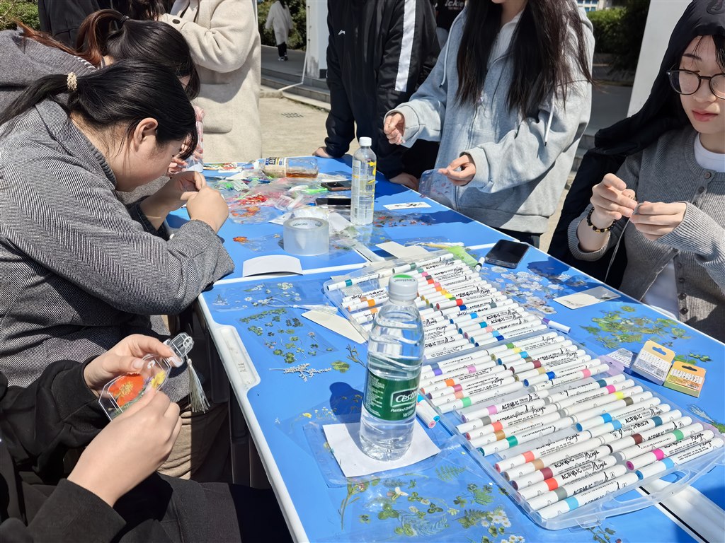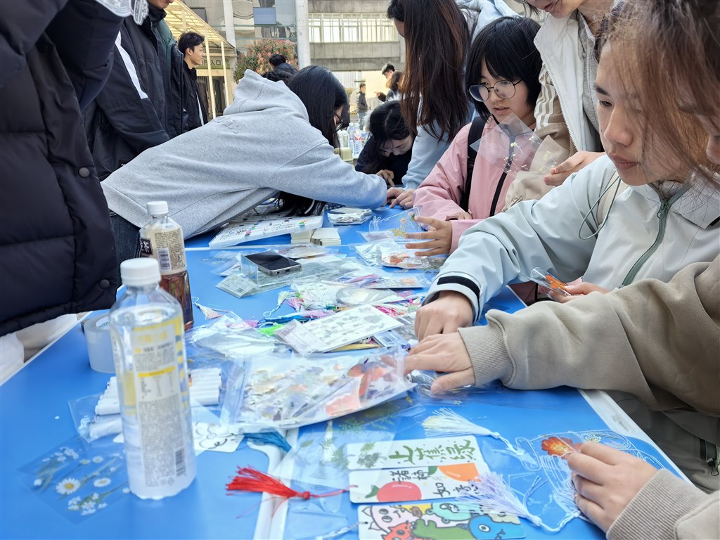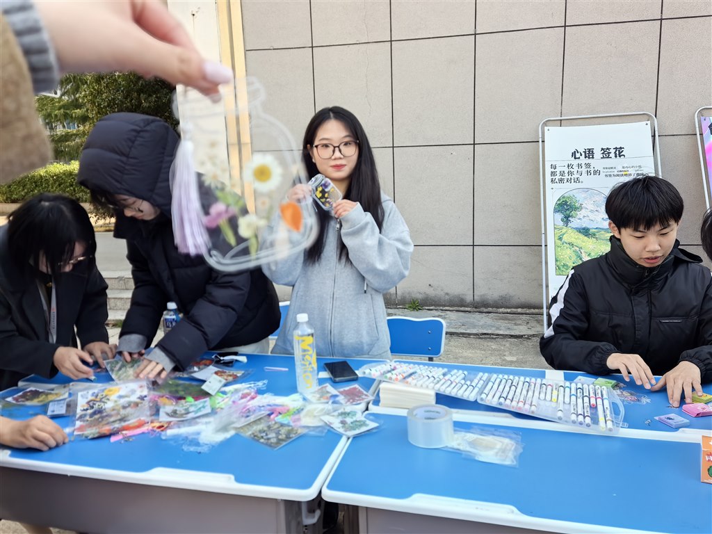 活動(dòng)現(xiàn)場,“心語花簽”區(qū)域彌漫著浪漫的氣息,參與者們精心挑選干花與貼紙,將其組合在透明書簽之上,制作出獨(dú)一無二的美好。