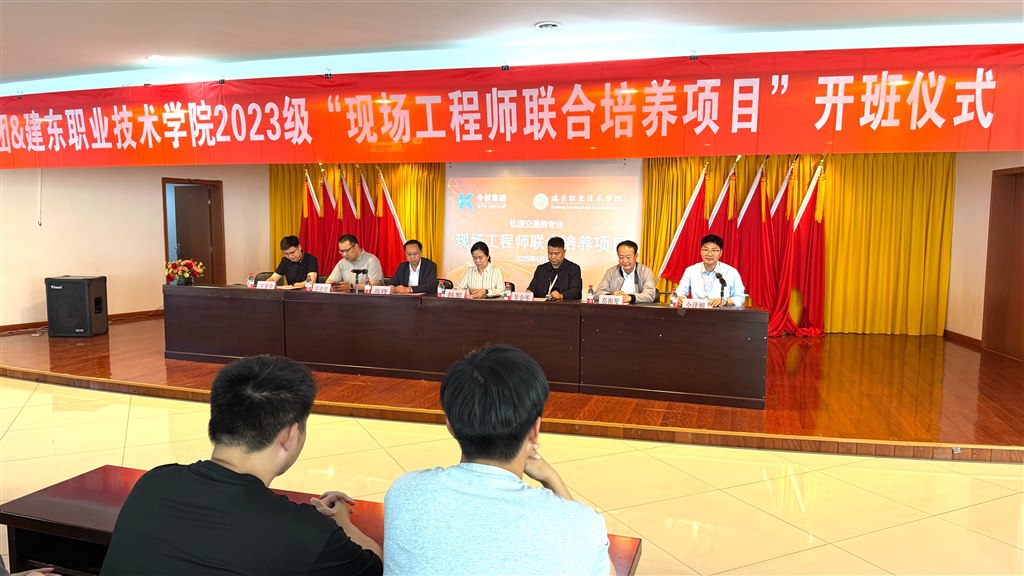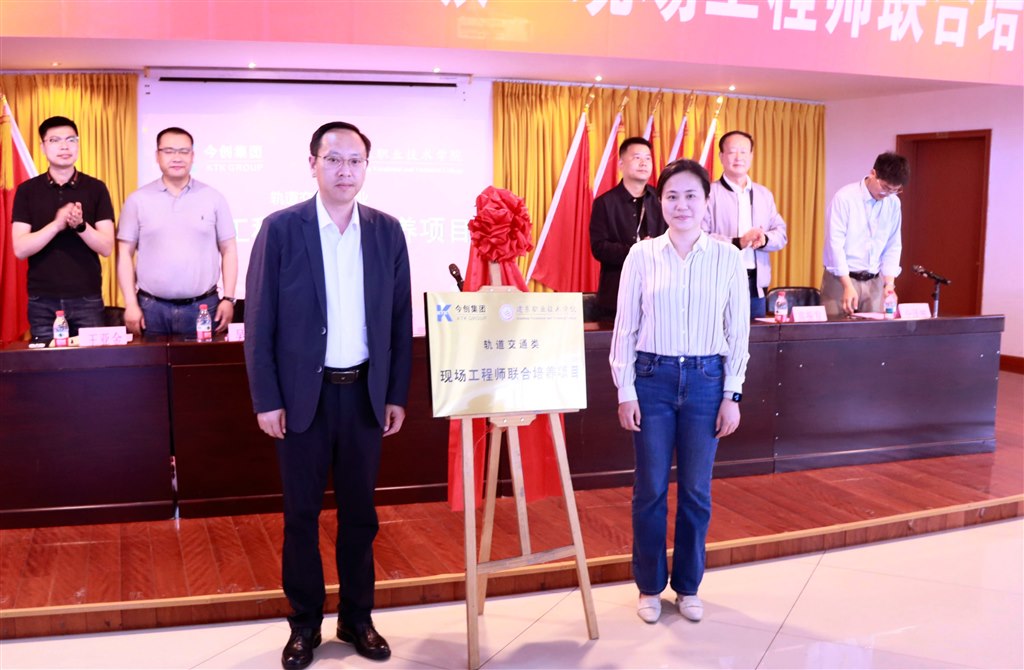 在全場(chǎng)師生的共同見證下,韓黎與高峰共同為“今創(chuàng)集團(tuán)&建東職業(yè)技術(shù)學(xué)院現(xiàn)場(chǎng)工程師聯(lián)合培養(yǎng)項(xiàng)目”揭牌。這一歷史性的時(shí)刻,標(biāo)志著雙方在人才培養(yǎng)、科技創(chuàng)新等方面的合作邁上了新的臺(tái)階,將為軌道交通行業(yè)培養(yǎng)更多高素質(zhì)、高技能的應(yīng)用型人才。