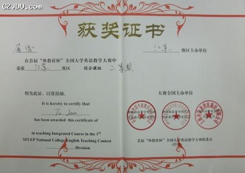 2010年5月7日至9日,由教育部高等學(xué)校外語(yǔ)專(zhuān)業(yè)教學(xué)指導(dǎo)委員會(huì)、教育部高等學(xué)校大學(xué)外語(yǔ)教學(xué)指導(dǎo)委員會(huì)和上海外語(yǔ)教育出版社共同主辦,蘇州大學(xué)承辦的的首屆“外教社杯”全國(guó)(本專(zhuān)科院校)大學(xué)英語(yǔ)教學(xué)大賽中,應(yīng)用外語(yǔ)系屠俊老師發(fā)揮出色,獲得江蘇省二等獎(jiǎng),且位列在常高校選手排名第一名的好成績(jī)。