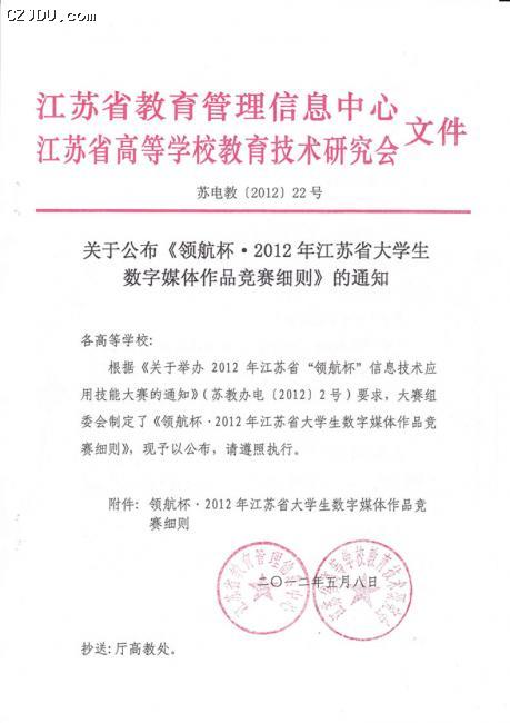 (2)《2012年江蘇省“領(lǐng)航杯”大學(xué)生數(shù)字媒體作品競(jìng)賽參賽報(bào)名表》(附表3):由第一作者簽名并蓋學(xué)校公章,隨作品一同寄送(一式兩份)。