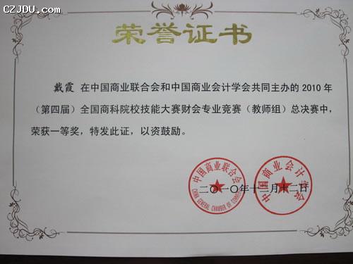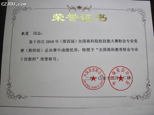 12月11日上午,經(jīng)濟管理系戴霞老師在中國商業(yè)聯(lián)合會和中國商業(yè)會計學(xué)會聯(lián)合主辦、中國商業(yè)聯(lián)合會商業(yè)職業(yè)技能鑒定指導(dǎo)中心承辦的第四屆全國商科院校技能大賽財會專業(yè)“說課競賽”2010年總決賽中獲教師組一等獎和“全國商科教育財會專業(yè)十佳教師”的稱號。