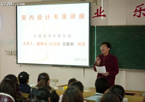 媒體與藝術(shù)設(shè)計(jì)系為了進(jìn)一步落實(shí)校企合作,培養(yǎng)為社會(huì)歡迎的適用人才,借助于常州建筑設(shè)計(jì)研究會(huì)這一平臺(tái),與常州市裝潢設(shè)計(jì)行業(yè)建立了廣泛而深入的聯(lián)系。3月10日下午,該系室內(nèi)設(shè)計(jì)技術(shù)專業(yè)2009級(jí)、2010級(jí)兩屆220多名學(xué)生,在第一教學(xué)樓302多媒體教室聽取了一堂生動(dòng)而切合實(shí)際的講座--由大成裝潢有限公司董事長(zhǎng)、總經(jīng)理、高級(jí)室內(nèi)設(shè)計(jì)師吳震昶先生作的“室內(nèi)設(shè)計(jì)案例分析”專題講座。