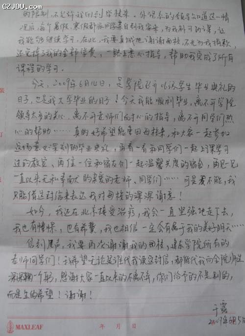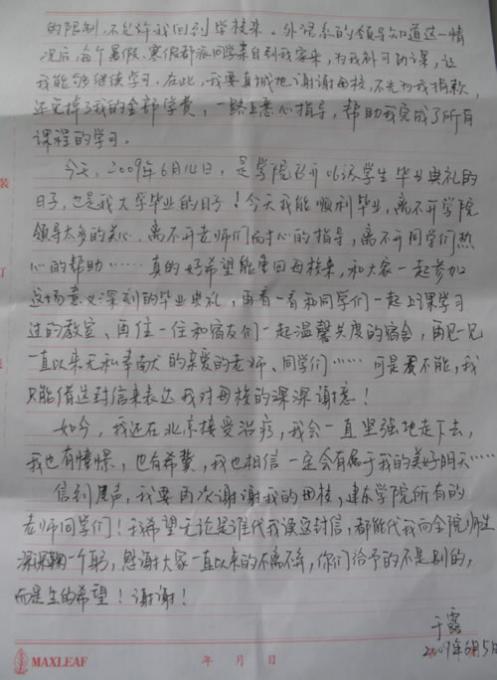 信到尾聲,我要再次謝謝我的母校,建東學(xué)院所有的老師同學(xué)們!我希望無(wú)論是誰(shuí)代我讀這封信,都能代我向全院師生深深鞠一躬,感謝大家一直以來(lái)的不離不棄,你們給予的不是別的,而是生的希望!謝謝!