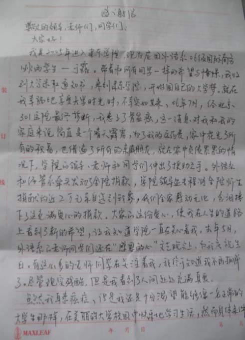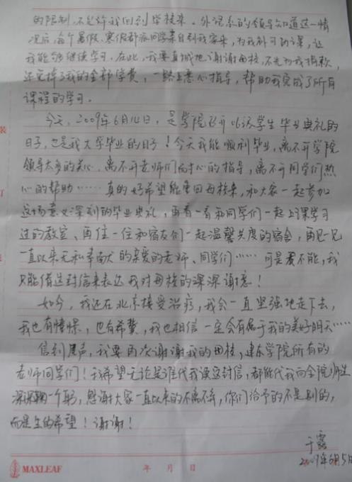 雖然我身患癌癥,但是我還是十分渴望能夠像一名正常的大學(xué)生那樣,在美麗的大學(xué)校園中快樂(lè)地學(xué)習(xí)生活,然而身體條件的限制,不允許我回到學(xué)校來(lái)。外語(yǔ)系的領(lǐng)導(dǎo)知道這一情況后,每個(gè)暑假、寒假都派同學(xué)親自到我家來(lái),為我補(bǔ)習(xí)功課,讓我能夠繼續(xù)學(xué)習(xí)。在此,我要真誠(chéng)地謝謝母校,不光為我捐款,還免掉了我全部的學(xué)費(fèi),一路上悉心指導(dǎo),幫助我完成了所有課程的學(xué)習(xí)。
