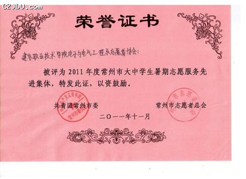 我校機械工程系志愿者協(xié)會、、電子與電氣工程系志愿者協(xié)會、藝術設計系志愿者協(xié)會分別榮獲“2011年度常州市大中學生暑期志愿服務先進集體”榮譽稱號。蔣雯、駱建華、孔葉旋、鄒驍、莊雙雙、孫凱、朱磊、趙靜等8位同學榮獲“2011年度常州市大中學生暑期志愿服務先進個人”榮譽稱號。