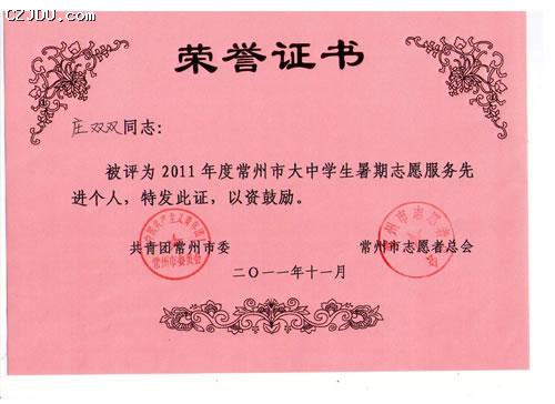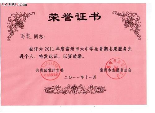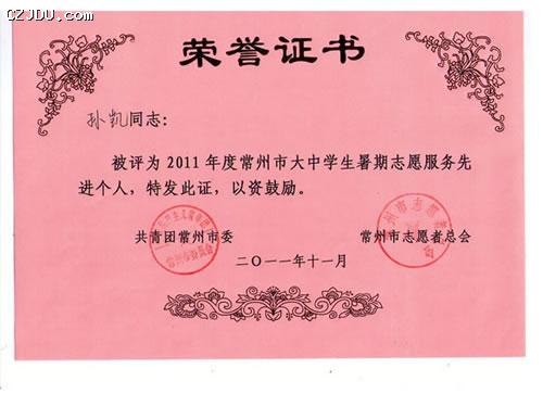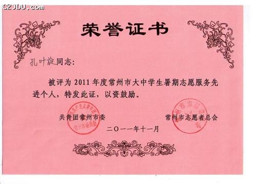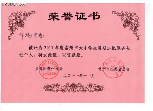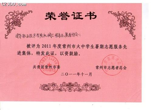“2011年度常州市大中學生暑期志愿服務先進集體”、“2011年度常州市大中學生暑期志愿服務先進個人”評選表彰活動由共青團常州市委、常州市志愿者總會聯(lián)合舉辦。此次評選活動旨在大力弘揚“奉獻、友愛、互助、進步”的志愿者精神,發(fā)揮先進典型的示范帶動作用,促進青年志愿者行動深入開展,大力弘揚社會主義榮辱觀,推動我市社會和諧進步和跨越式發(fā)展。