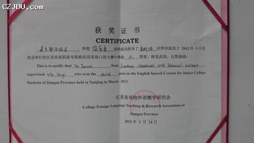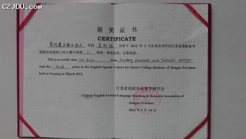 近日,從第八屆“高教社杯”全國高職高專實用英語口語大賽江蘇賽區(qū)傳來喜訊,我院經(jīng)濟管理系11級吳昕怡同學在大賽中嶄露頭角,獲得非專業(yè)組三等獎的好成績,基礎部
