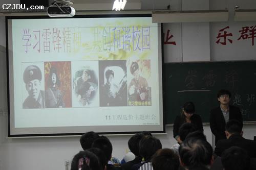 值紀(jì)念雷鋒同志犧牲50周年之際,根據(jù)教育部發(fā)布的《中共中央辦公廳關(guān)于深入開展學(xué)雷鋒活動的意見》及《省委教育工委省教育廳關(guān)于在全省教育系統(tǒng)深入持久開展學(xué)雷鋒活動的通知》(蘇教社政〔2012〕4號)的精神和總體要求,我院積極貫徹黨的教育方針,深入推進(jìn)社會主義核心價值體系建設(shè),進(jìn)一步加強(qiáng)和改進(jìn)大學(xué)生思想政治教育。4月25日在J102多媒體教室我院開展“學(xué)習(xí)雷鋒事跡,弘揚(yáng)雷鋒精神” 主題班會競賽活動。