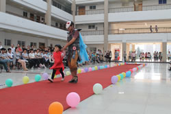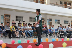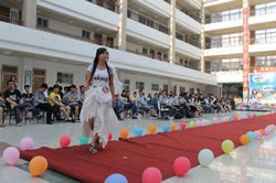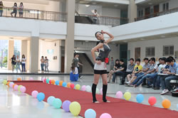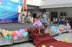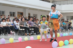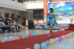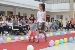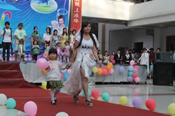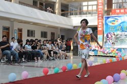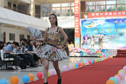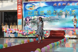 在動感活力的街舞和觀眾的歡呼聲中,比賽正式拉開帷幕。模特們身著自己隊伍設(shè)計的環(huán)保服飾,款款走上舞臺。大方自信的腳步,獨特新穎的服飾設(shè)計,不時贏得觀眾的陣陣掌聲。此次比賽的最大亮點在于衣服的材料和設(shè)計理念,觀眾只要經(jīng)過認真觀察就會驚訝地發(fā)現(xiàn),高雅的白色晚禮服是由廢棄的一次性桌布縫制而成,時尚短裙則是用蚊帳粘接的,醒目耀眼的男裝是廢棄的廣告海報和塑料袋的完美結(jié)合……一些平常生活中的垃圾材料塑料帶、報紙、蚊帳、購物袋、舊光盤等在參賽選手“魔術(shù)”般的變換中生成了一件件華麗多彩的服飾作品。在設(shè)計理念上,參賽者更是別具匠心地將四季、動漫、中國風等因素與環(huán)保主題相結(jié)合,給觀眾帶來一場精彩的視覺盛宴?;顒蝇F(xiàn)場,天潤幼兒園的小朋友們也給我們帶來了精彩的幼兒環(huán)保時裝秀??蓯鄣男∧L兀路f的設(shè)計,極大的沖擊著觀眾們的眼球。
