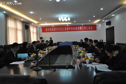 會上,王榮成院長首先介紹了學院概況并對考核驗收組的領導蒞臨我院指導表示感謝。范永法書記向市“江蘇省平安校園”考核驗收組領導和專家作了題為《建東職業(yè)技術學院 “江蘇省平安校園”創(chuàng)建工作匯報》,范永法書記的匯報共分六個方面。一是學院領導高度重視,成立相應組織機構;二是明確安全穩(wěn)定責任,簽訂安全穩(wěn)定責任狀;三是職責明確,制度完善,確保安全穩(wěn)定工作有章可循、科學規(guī)范;四是加強法制、安全、心理健康教育,鞏固教育成果;五是加強人防、物防、技防結合,提高綜合治理水平;六是維護校園政治穩(wěn)定,綜合整治校園安全秩序。