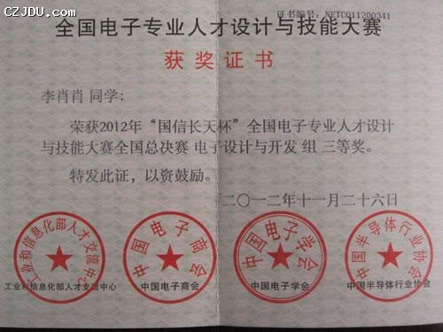 2012年11月23日上午,我院電子與電氣工程系10電氣自動(dòng)化專(zhuān)業(yè)鄭成方同學(xué)、11應(yīng)用電子技術(shù)專(zhuān)業(yè)李肖肖同學(xué)參加了第四屆全國(guó)電子專(zhuān)業(yè)人才設(shè)計(jì)與技能大賽電子設(shè)計(jì)與開(kāi)發(fā)項(xiàng)目的全國(guó)總決賽。經(jīng)過(guò)5個(gè)小時(shí)的封閉式考核,與200多名本專(zhuān)科院校學(xué)生同場(chǎng)競(jìng)技,兩位同學(xué)最終都取得了總決賽三等獎(jiǎng)的好成績(jī)。侯玉杰、吳玲老師榮獲優(yōu)秀指導(dǎo)教師稱號(hào)。