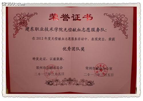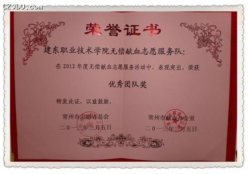 建東學(xué)院在2012年度常州市無償獻血志愿服務(wù)活動中榮獲優(yōu)秀團隊獎
