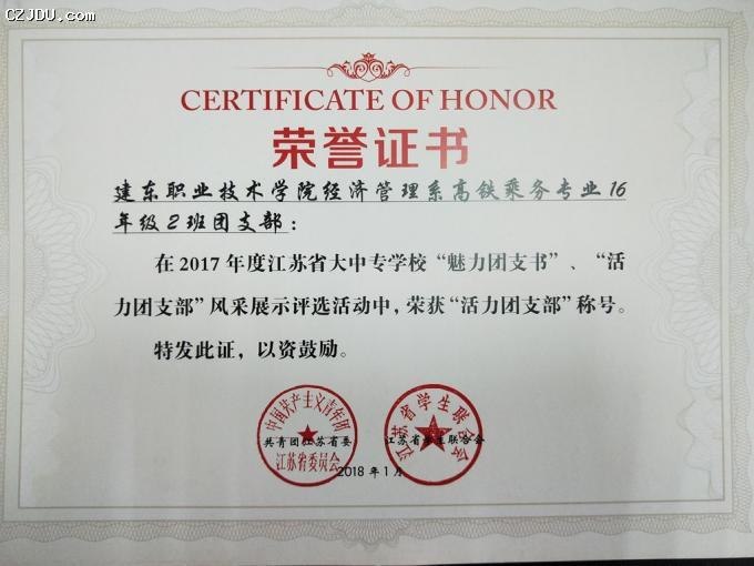 近日,共青團江蘇省委發(fā)布了《關于表彰2017年度江蘇省大中專學?!镑攘F支書”、“活力團支部”的決定》,表彰了2017年度江蘇省大中專學?!镑攘F支書”、“活力團支部”。經學校組織推薦和專家嚴格評審,全省共有100余位團支部書記被授予“魅力團支書”稱號,共有近300個團支部被授予“活力團支部”稱號。我院經濟管理系系16級高鐵乘務2班團支部被評為江蘇省“活力團支部”。