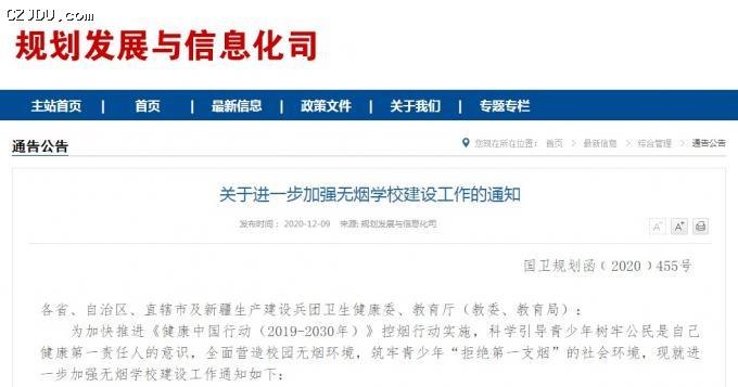 近日教育部聯(lián)合國家衛(wèi)生健康委印發(fā)《關(guān)于進(jìn)一步加強(qiáng)無煙學(xué)校建設(shè)工作的通知》,力爭(zhēng)到2022年底實(shí)現(xiàn)各級(jí)各類學(xué)校全面建成無煙學(xué)校的目標(biāo)。