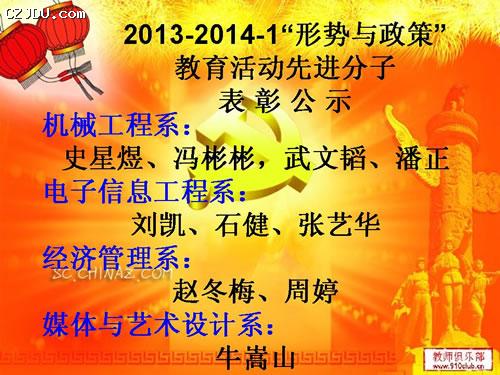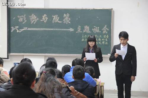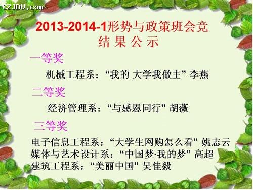 本次主題班會(huì)競(jìng)賽內(nèi)容分為兩大部分:一部分是班會(huì)活動(dòng),要求緊扣2013年時(shí)事熱點(diǎn)、黨和國(guó)家政策導(dǎo)向,利用班會(huì)對(duì)大學(xué)生進(jìn)行思想政治教育;另一部分是日常思政實(shí)踐教育展示,要求參賽班級(jí)將日常所開展或參與的校內(nèi)外、系部、班級(jí)各類思想政治實(shí)踐教育活動(dòng)利用PPT進(jìn)行匯報(bào)展示,以此提供給各系一個(gè)全面展示班級(jí)德育活動(dòng)風(fēng)采的機(jī)會(huì)。