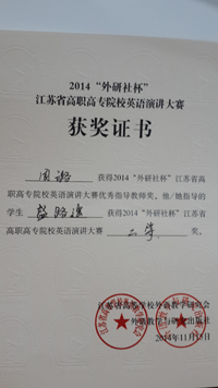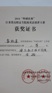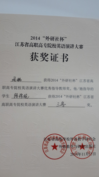 本屆大賽分預(yù)賽、復(fù)賽和決賽三階段。預(yù)賽由參賽各校進(jìn)行校內(nèi)選拔,復(fù)賽和決賽于11月14日和15日進(jìn)行現(xiàn)場對決。復(fù)賽階段,選手根據(jù)抽簽順序和要求進(jìn)行3分鐘圍繞著《The Color Of The World》(世界的色彩)進(jìn)行定題演講和回答評委提問。此次比賽我院三位選手備賽時間緊張,僅一周備賽時間;比賽現(xiàn)場高手云集,角逐激烈,很多都是是有著豐富大賽經(jīng)驗的“老賽手”;比賽淘汰率也很高(30%的淘汰率)。但是,我院選派的三位選手頂住了各種壓力,憑借高強度訓(xùn)練后扎實的英語功底和培養(yǎng)出的良好心理素質(zhì),在眾多選手中脫穎而出,分別獲得二等獎和三等獎的好成績,為我院爭得了榮譽,也再一次體現(xiàn)了我院英語教學(xué)水平。這既是我院英語教學(xué)成果的體現(xiàn),亦將進(jìn)一步推動我院繼續(xù)深化英語教學(xué)改革。