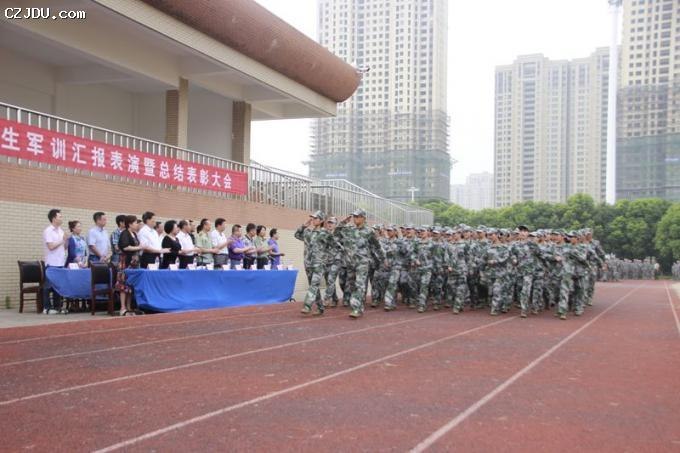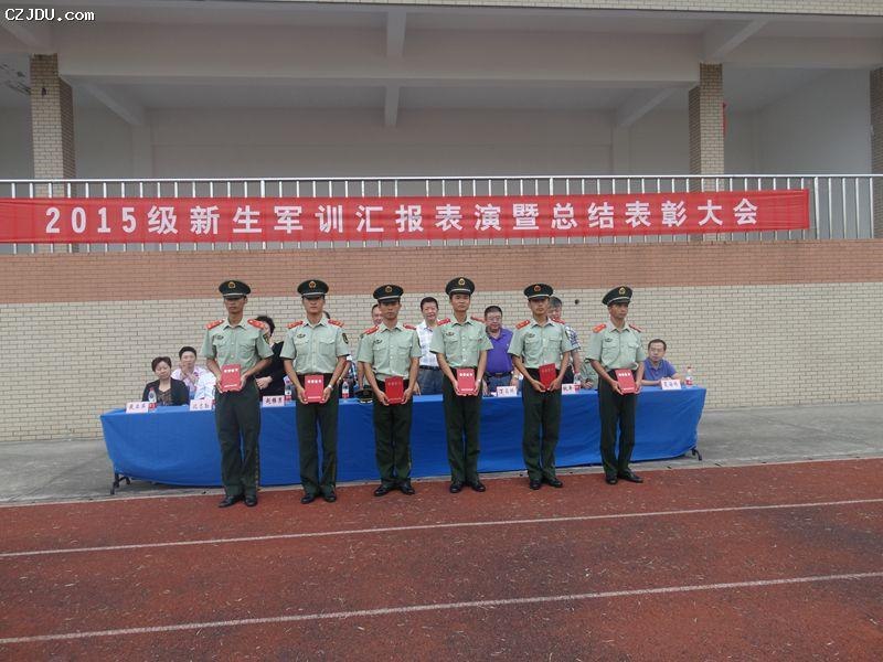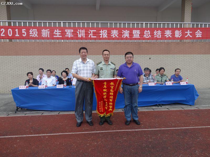 表彰大會在雄壯的國歌聲中正式開始。隨著分列式進行曲的響起,各方陣踏著矯健的步伐,整齊劃一地邁過主席臺,接受學院領導和承訓部隊首長的檢閱。表演方隊隨后進行了精彩的軍體拳表演。表演結束后,孫利兵副院長宣讀了我院《關于表彰2015級新生軍訓先進集體及個人的決定》。2個先進營、6個先進連隊、68個衛(wèi)生文明宿舍、6名優(yōu)秀教官、6名優(yōu)秀指導員、50名軍訓優(yōu)秀學員受到了表彰。在歡快的樂曲聲中,主席臺前排領導為軍訓先進集體和優(yōu)秀個人頒獎并合影留念。院長王榮成、黨委書記丁高明向部隊授予了錦旗。