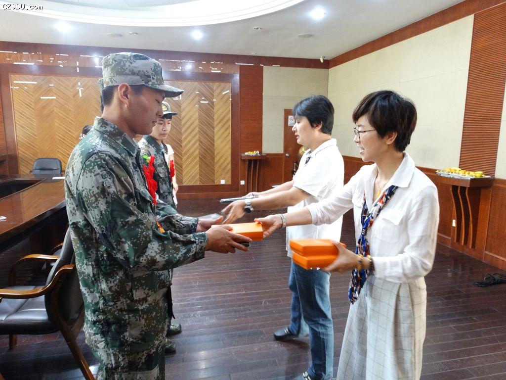 講話結束后,劉如處長和季艷副處長給大學生新兵贈送學習用品,并與大學生新兵合影留念。