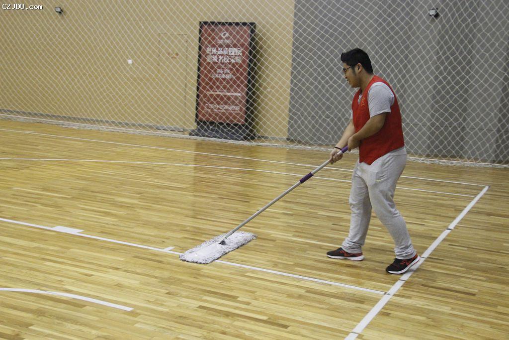 為防止隊員摔倒,保持地面干燥,我院志愿者在默默無聞的拖地