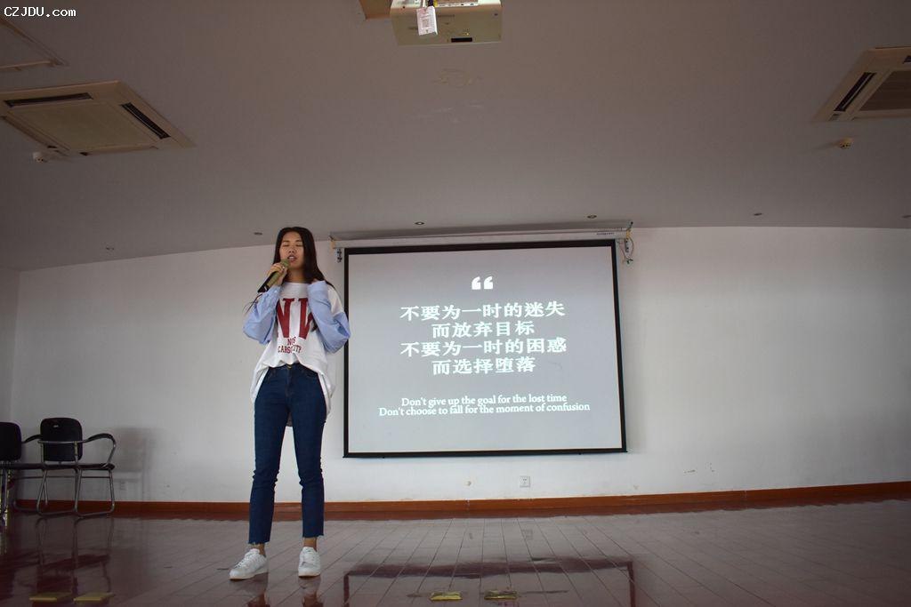 最后,“自強(qiáng)之星”的四名同學(xué):沈鴻飛、張洪順、曹士林與錢逸軒首先用演講結(jié)合PPT演示的形式向同學(xué)們展示了他們?cè)谛赡甓鄷r(shí)間內(nèi),在學(xué)習(xí)、生活、工作等各方面成長(zhǎng)的過(guò)程中如何克服挫折、自立自強(qiáng)從而收獲成績(jī)。然后,用一首《少年中國(guó)說(shuō)》的激情演繹鼓舞全場(chǎng)所有新生,少年需自強(qiáng)。