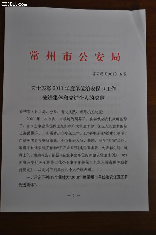 日前,我院保衛(wèi)處被常州市公安局授予“2010年度常州市單位治安保衛(wèi)工作先進(jìn)集體”榮譽(yù)稱號(常公局[2011]16號文)。