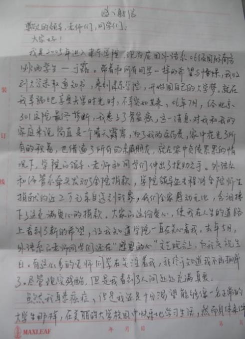 雖然我身患癌癥,但是我還是十分渴望能夠像一名正常的大學(xué)生那樣,在美麗的大學(xué)校園中快樂(lè)地學(xué)習(xí)生活,然而身體條件的限制,不允許我回到學(xué)校來(lái)。外語(yǔ)系的領(lǐng)導(dǎo)知道這一情況后,每個(gè)暑假、寒假都派同學(xué)親自到我家來(lái),為我補(bǔ)習(xí)功課,讓我能夠繼續(xù)學(xué)習(xí)。在此,我要真誠(chéng)地謝謝母校,不光為我捐款,還免掉了我全部的學(xué)費(fèi),一路上悉心指導(dǎo),幫助我完成了所有課程的學(xué)習(xí)。