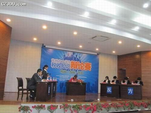 4月28日下午,常州市首屆大學(xué)生稅務(wù)知識辯論賽決賽在常州工學(xué)院圓滿落幕。本次辯論賽以“稅收•發(fā)展•民生”為主題,由常州市地稅局聯(lián)合常州市委宣傳部、常州市教育局、常州市國家稅務(wù)局、共青團(tuán)常州市委員會共同主辦,由常州市高新區(qū)國稅局、常州市地方稅務(wù)局第四稅務(wù)分局和常州工學(xué)院共同承辦,全程比賽均在常工院舉行。辯論賽共有包括我院在內(nèi)的13所在常高校和高職校參與,比賽分初賽、復(fù)賽、半決賽、決賽四個環(huán)節(jié)12場辯論。