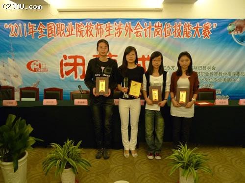 獲獎(jiǎng)師生合影(09會(huì)計(jì)專業(yè)5班學(xué)生張騰、教師高慧、1班學(xué)生凌雅、1班學(xué)生柳云婷(左起))