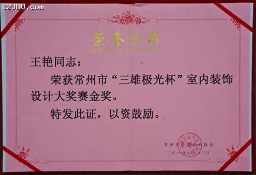 由常州市科學(xué)技術(shù)協(xié)會(huì)頒發(fā)的室內(nèi)設(shè)計(jì)大獎(jiǎng)賽金獎(jiǎng)榮譽(yù)證書