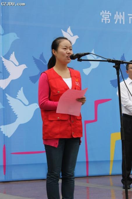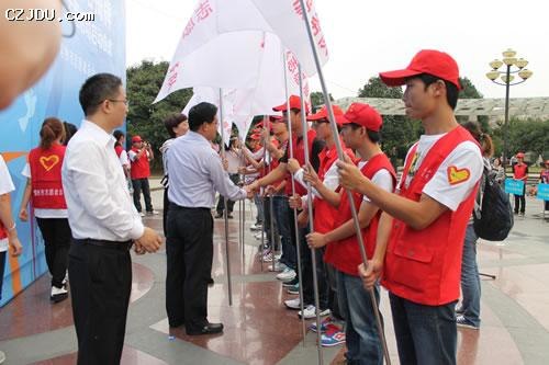 啟動儀式上,我院蔣雯同學代表志愿者宣讀了“萬名大學生志愿者進社區(qū)”的倡議書,市領導也向10所高校的志愿者代表授旗。