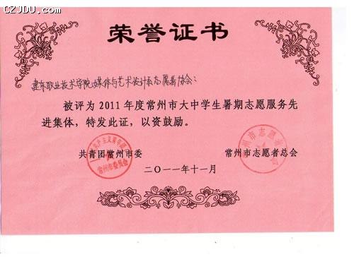 我校機械工程系志愿者協(xié)會、、電子與電氣工程系志愿者協(xié)會、藝術設計系志愿者協(xié)會分別榮獲“2011年度常州市大中學生暑期志愿服務先進集體”榮譽稱號。蔣雯、駱建華、孔葉旋、鄒驍、莊雙雙、孫凱、朱磊、趙靜等8位同學榮獲“2011年度常州市大中學生暑期志愿服務先進個人”榮譽稱號。
