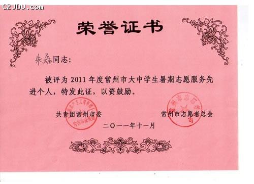 “2011年度常州市大中學生暑期志愿服務先進集體”、“2011年度常州市大中學生暑期志愿服務先進個人”評選表彰活動由共青團常州市委、常州市志愿者總會聯(lián)合舉辦。此次評選活動旨在大力弘揚“奉獻、友愛、互助、進步”的志愿者精神,發(fā)揮先進典型的示范帶動作用,促進青年志愿者行動深入開展,大力弘揚社會主義榮辱觀,推動我市社會和諧進步和跨越式發(fā)展。