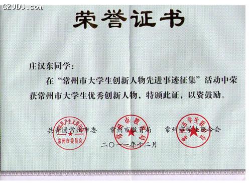 我院藝術(shù)系莊漢東同學(xué)在“常州市大學(xué)生創(chuàng)新人物事跡征集”活動中榮獲“常州市大學(xué)生優(yōu)秀創(chuàng)新人物”榮譽(yù)稱號