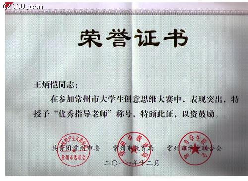 我院機(jī)械系王炳愷老師在參加“常州市大學(xué)生創(chuàng)意思維大賽”中,表現(xiàn)突出,榮獲“優(yōu)秀指導(dǎo)老師”榮譽(yù)稱號