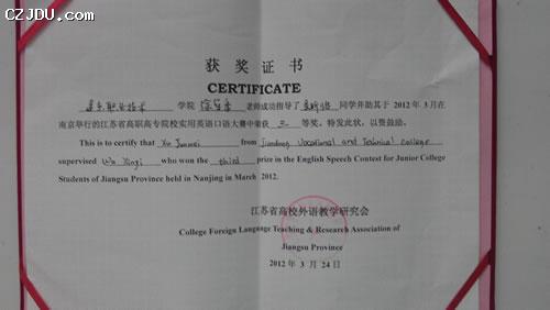 近日,從第八屆“高教社杯”全國高職高專實用英語口語大賽江蘇賽區(qū)傳來喜訊,我院經(jīng)濟管理系11級吳昕怡同學在大賽中嶄露頭角,獲得非專業(yè)組三等獎的好成績,基礎部