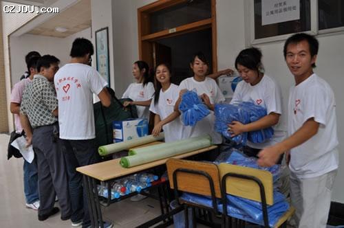 迎新工作人員和志愿者為新生發(fā)放生活用品