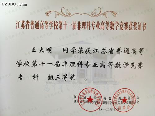 近日,從“江蘇省普通高等學(xué)校第十一屆高等數(shù)學(xué)競(jìng)賽”主辦方傳來(lái)喜訊,我院建筑工程系10級(jí)工程造價(jià)專(zhuān)業(yè)王大明同學(xué)在此次競(jìng)賽中獲得專(zhuān)科組三等獎(jiǎng)的好成績(jī)。
