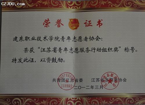 我院青年志愿者協(xié)會(huì)日前被團(tuán)省委、省志愿者協(xié)會(huì)授予“江蘇省青年志愿服務(wù)行動(dòng)組織獎(jiǎng)”榮譽(yù)稱號(hào)。這是我院青年志愿者協(xié)會(huì)繼榮獲多項(xiàng)市級榮譽(yù)后首次獲得的省級志愿服務(wù)工作獎(jiǎng)項(xiàng)?! ?span lang="EN-US">