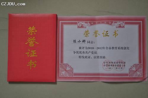 陳小娜榮獲2010-2012年全市教育系統(tǒng)創(chuàng)先爭優(yōu)優(yōu)秀共產黨員榮譽稱號