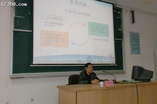會上,李志會部長首先就常州市青年創(chuàng)業(yè)項(xiàng)目大賽向同學(xué)們詳細(xì)介紹了大賽的宗旨、參賽方式、參賽對象、組織機(jī)構(gòu)、獎勵辦法等,本次大賽旨在充分發(fā)揮大學(xué)生就業(yè)創(chuàng)業(yè)教育的平臺功能,準(zhǔn)確把握大學(xué)生在創(chuàng)業(yè)中最現(xiàn)實(shí)、最緊迫、最需要解決的問題,努力提高大學(xué)生創(chuàng)業(yè)就業(yè)的意識和技能。