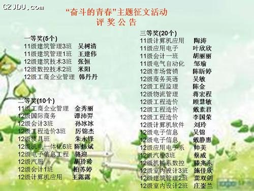 11級計算機應(yīng)用陶濤;11級應(yīng)用電子葉欣欣; 11級會計一班胡麗麗;11級電氣自動化鄒瑜;12級市場營銷陳盺婷; 12級商務(wù)英語吳敏;12級工程監(jiān)理陳金; 12級物流管理蔣宏程; 12級工程造價顧慧敏 ;12級工程造價