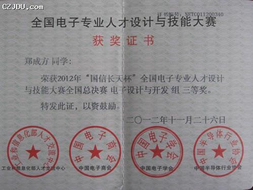 2012年11月23日上午,我院電子與電氣工程系10電氣自動(dòng)化專(zhuān)業(yè)鄭成方同學(xué)、11應(yīng)用電子技術(shù)專(zhuān)業(yè)李肖肖同學(xué)參加了第四屆全國(guó)電子專(zhuān)業(yè)人才設(shè)計(jì)與技能大賽電子設(shè)計(jì)與開(kāi)發(fā)項(xiàng)目的全國(guó)總決賽。經(jīng)過(guò)5個(gè)小時(shí)的封閉式考核,與200多名本專(zhuān)科院校學(xué)生同場(chǎng)競(jìng)技,兩位同學(xué)最終都取得了總決賽三等獎(jiǎng)的好成績(jī)。侯玉杰、吳玲老師榮獲優(yōu)秀指導(dǎo)教師稱號(hào)。