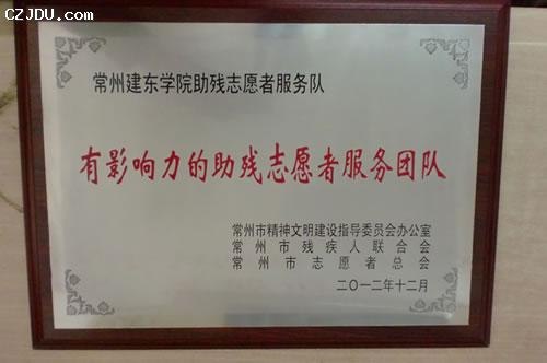 為紀(jì)念第21個(gè)“國(guó)際助殘日”和第27個(gè)“世界志愿者日”,12月6日下午,由常州市文明辦、常州市殘聯(lián)、常州市志愿者主辦,常州市助殘志愿者承辦的“弘揚(yáng)雷鋒精神•倡導(dǎo)助殘風(fēng)尚”2012常州市助殘志愿者聯(lián)誼活動(dòng)在常州市殘疾人康復(fù)中心多功能廳舉行,我市21個(gè)助殘志愿者服務(wù)隊(duì)代表、殘疾人及親友代表400余人參加活動(dòng)。我院助殘志愿者服務(wù)隊(duì)等9個(gè)團(tuán)體被授予“有影響力的助殘志愿者服務(wù)團(tuán)隊(duì)”稱號(hào),并頒發(fā)獎(jiǎng)牌。