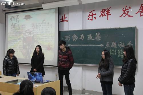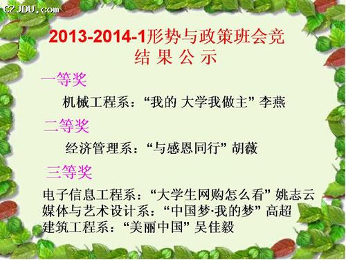 本次主題班會(huì)競(jìng)賽內(nèi)容分為兩大部分:一部分是班會(huì)活動(dòng),要求緊扣2013年時(shí)事熱點(diǎn)、黨和國(guó)家政策導(dǎo)向,利用班會(huì)對(duì)大學(xué)生進(jìn)行思想政治教育;另一部分是日常思政實(shí)踐教育展示,要求參賽班級(jí)將日常所開展或參與的校內(nèi)外、系部、班級(jí)各類思想政治實(shí)踐教育活動(dòng)利用PPT進(jìn)行匯報(bào)展示,以此提供給各系一個(gè)全面展示班級(jí)德育活動(dòng)風(fēng)采的機(jī)會(huì)。