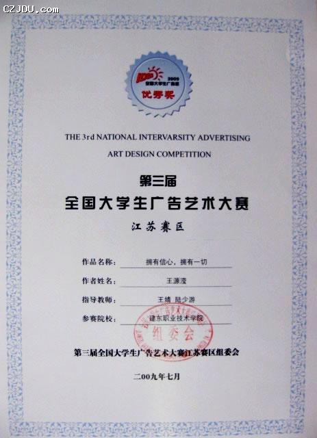 全國高等學校第三界廣告藝術(shù)大賽江蘇賽區(qū)的頒獎大會于2009年12月13日在南京舉行,我院媒體與藝術(shù)設(shè)計系07視覺傳達班王源瀅同學,獲得“第三屆全國大學生廣告藝術(shù)大賽江蘇賽區(qū)優(yōu)秀獎”,陸少游主任、王婧老師作為指導教師同時受到了表彰。