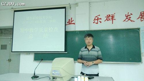 會上,鄭秋平處長首先闡明了期中教學檢查的目的,通過檢查發(fā)現(xiàn)并解決存在的問題,通過檢查加強教風和學風建設,通過檢查提高教學質(zhì)量和水平。隨后,鄭處長匯報了期中教學檢查工作的總體情況,對教學管理、教師教學規(guī)范、課程設置、教材選用規(guī)范以及實驗室管理情況作了充分肯定,并分析了教師在學情分析、課程標準、上課紀律、教學手段運用等方面存在的問題、提出了整改措施,最后特別提出了下一階段評估工作的重點是第二輪說課和專業(yè)剖析。