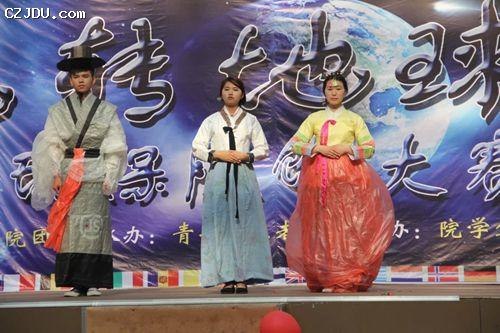 環(huán)保服飾大賽一等獎作品——經(jīng)管系志愿者協(xié)會代表隊設計的韓國服飾